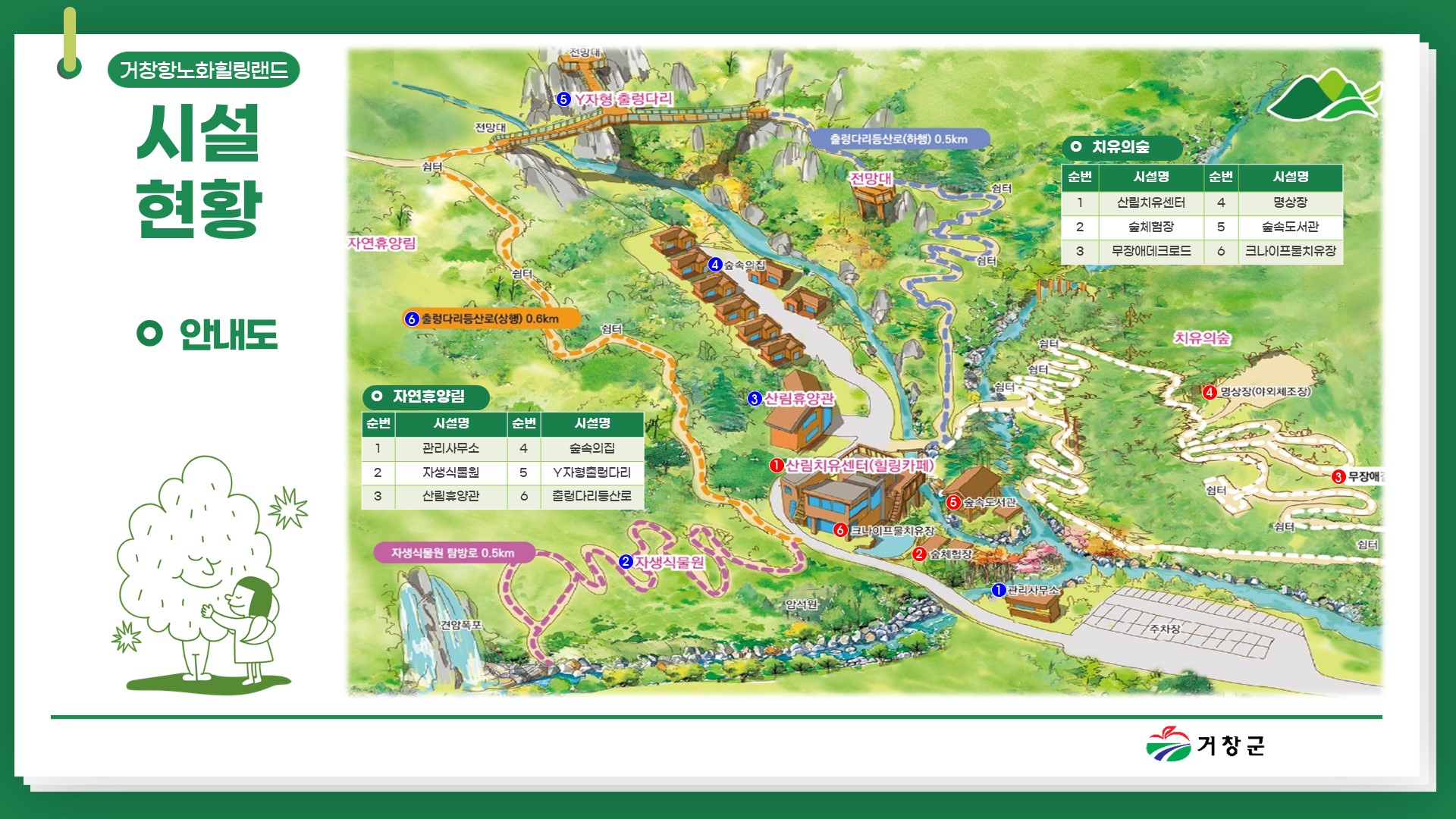 거창 항노화 힐링랜드는 해발 1,046m의 우두산 자락에 위치하여 천혜의 산림환경을 활용해 힐링과 치유를 주제로 조성되었다. 특히 국내 최초로 교각 없는 Y자형 출렁다리와 누구나 안전하고 편안하게 걸을 수 있는 무장애 데크로드가 설치되어 있다. 또 견암폭포를 배경으로 희귀식물을 감상할 수 있는 자생식물원이 조성되어 있고, 산림휴양관과 숲속의 집 등 숙박시설도 갖추고 있다. 주변에는 기이한 암봉들로 작은 금강산이라 불릴만큼 아름다운 의상봉, 비계산 등 명산을 즐길 수 있는 최적의 자연휴양 관광지이다.