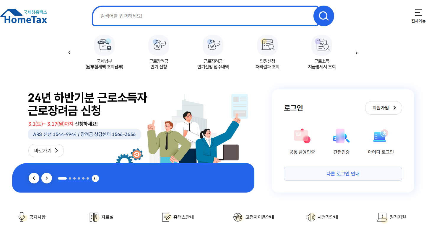 국세청 홈택스(www.hometax.go.kr)에 접속하여 화면과 같이 24년 하반기분 근로소득자 근로장려금 신청 바로가기 클릭하셔서 빠르게 신청하세요