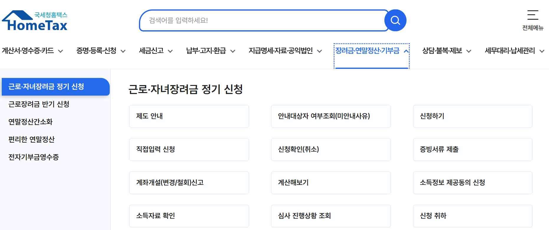 국세청 홈택스(www.hometax.go.kr)에 접속하여 화면과 같이 자녀장려금도 근로장려금 신청 바로가기 클릭하셔서 빠르게 신청하세요